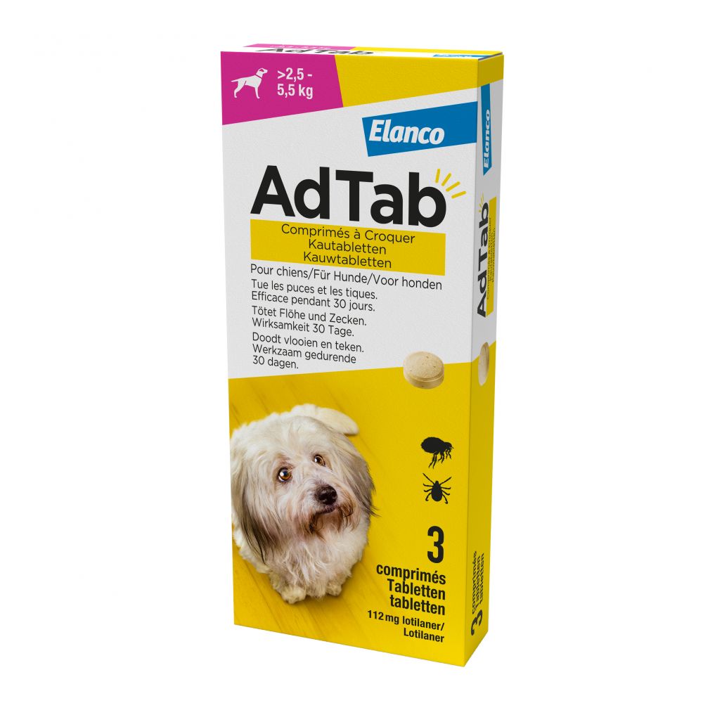 AdTab kauwtablet tegen teken en vlooien voor honden van 2,5 tot 5,5 kg, kauwtablet doodt teken en vlooien snel, biedt een maand lang bescherming en is gemakkelijk toe te dienen (3 stuks per verpakking)