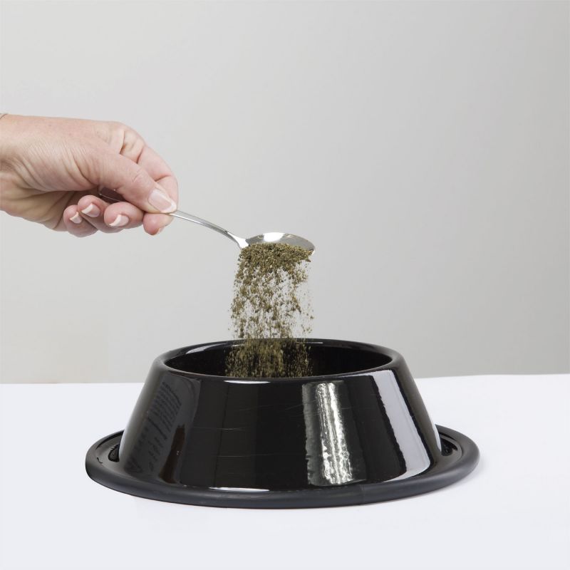 Door het voer mengen: kleine hond: 1 theelepel, middelgrote hond: 2 theelepels, grote hond: 1 eetlepel, kat en konijn: ½-1 theelepel, cavia: ½ theelepel, hamster: 1 mespuntje, vogel: 1-2 mespuntjes per 100 g voer.