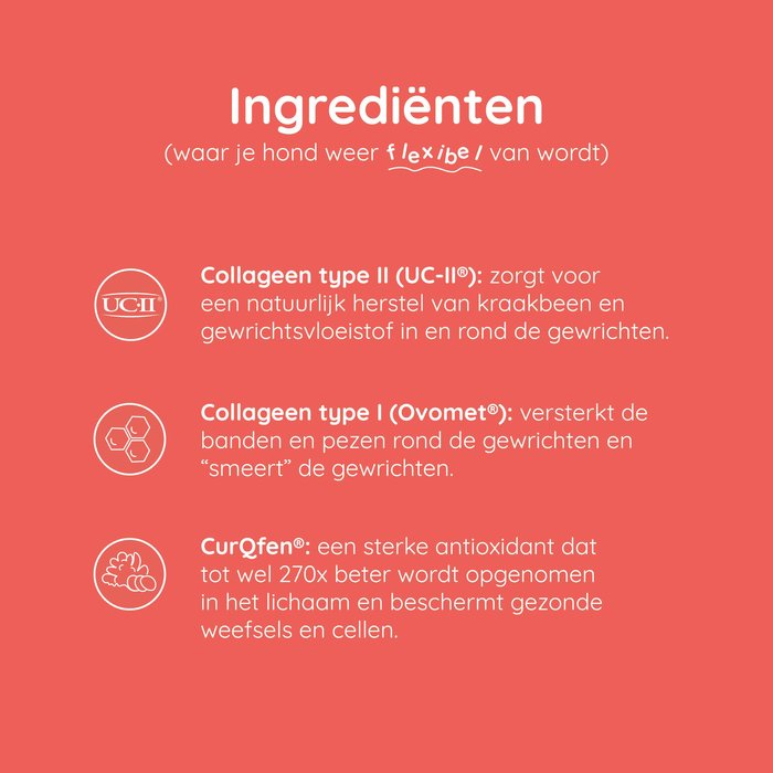 - Bevat hoogwaardige gepatenteerde ingrediënten: collageen type II (UC-II®), collageen type I (Ovomet®) en CurQfen®.