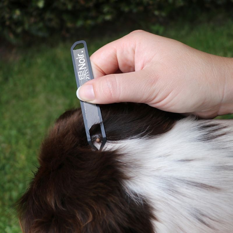 • Plaats de punt van de tekenverwijderaar over de teek heen, zo dicht mogelijk tegen de huid en maak een slepende beweging om de teek te verwijderen