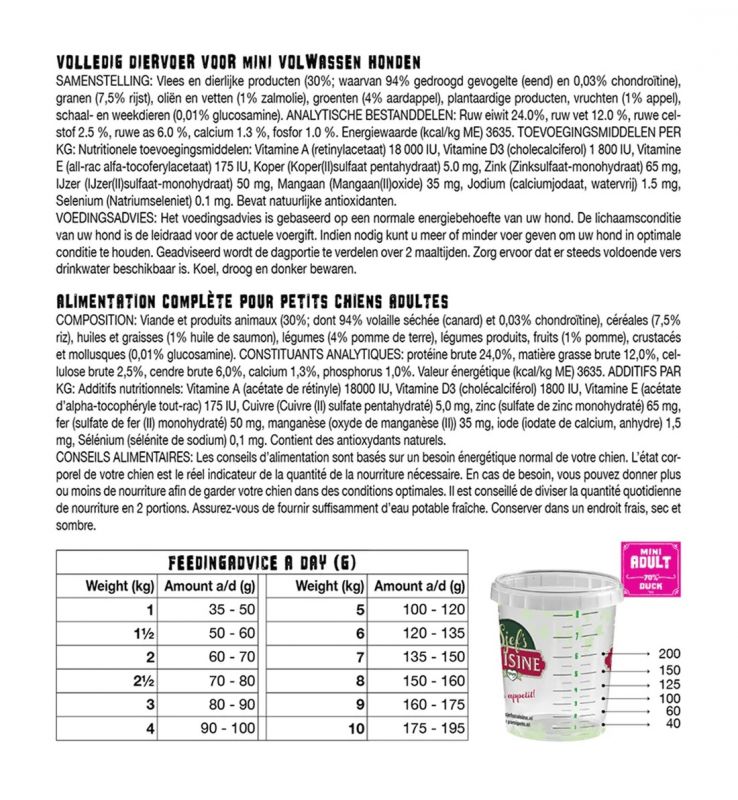 YamiPets Sjef's Cuisine Mini Adult is ontwikkeld voor volwassen honden van mini hondenrassen. Door de hoge energiebehoefte van kleinere honden heeft de Mini Adult een hoger gehalte aan vetten en eiwitten dan de producten voor grotere honden.