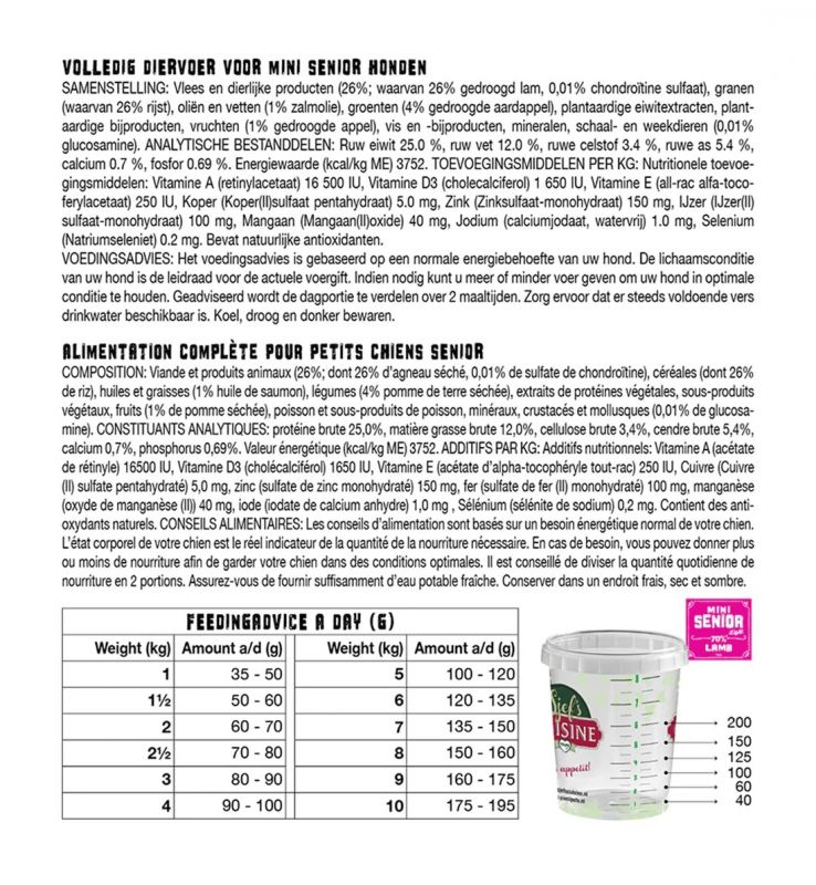 Sjef's Cuisine Mini Senior is er speciaal voor de oudere honden van mini hondenrassen. Lam als eiwitbron is zeer geschikt voor senior honden. Door lam te gebruiken is de Mini Senior heel licht verteerbaar. Doordat de oudere hond iets minder beweegt is het vet- en eiwitgehalte wat verlaagd. Lam is ook zeer geschikt voor honden met een gevoelige maag.