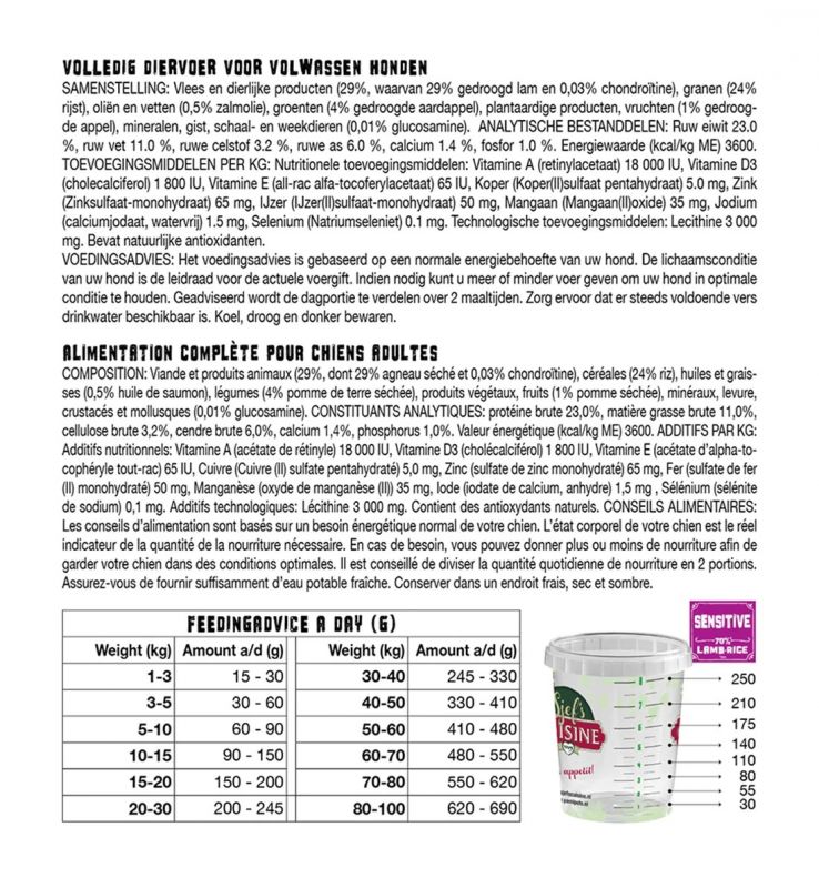 - Vlees en dierlijke producten (29%, waarvan 29% gedroogd lam en 0,03% chondroïtine), granen (24% rijst), oliën en vetten (0,5% zalmolie), groenten (4% gedroogde aardappel), plantaardige producten, vruchten (1% gedroogde appel), mineralen, gist, schaal- en weekdieren (0,01% glucosamine).