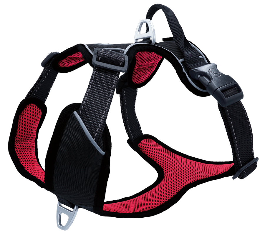 Het harnas heeft twee lichtgewicht aluminium D-ringen om de lijn aan te bevestigen, namelijk één op de rugzijde en één aan de borstzijde. Hiermee kun je het tuig eventueel ook als anti trektuig gebruiken. Tevens voorzien van een handvat op de rugzijde om de hond snel vast te kunnen houden. Ook zit er bovenop een bevestiging om een ID tag of veiligheidslampje aan vast te maken.