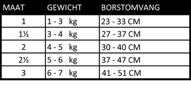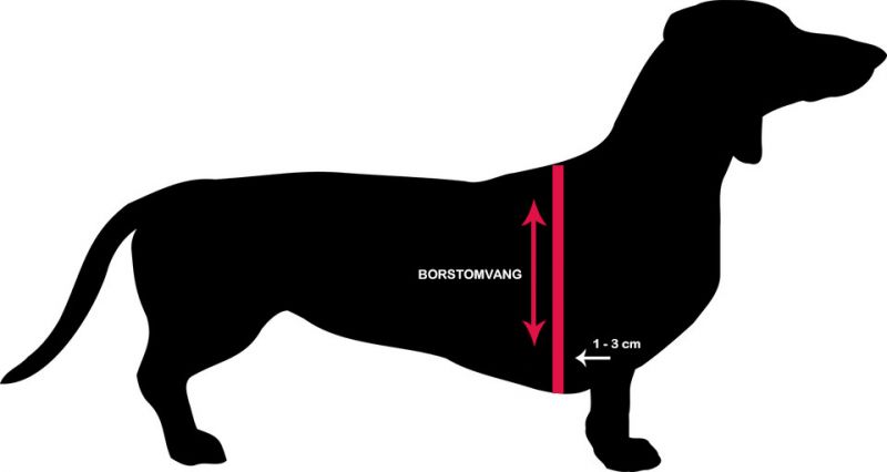 Gewicht is indicatief. Meet hierna de omvang van de borst van de hond op vanaf ongeveer 2 cm achter de oksels