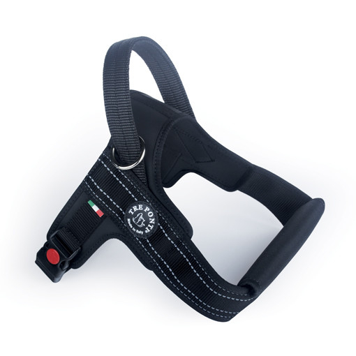 Het Tre Ponti Primo plus tuig is een allround stoer hondentuig. Het is uitstekend geschikt om mee te wandelen, te fietsen, te zwemmen en te sporten. Het model en de pasvorm is iets anders dan het basic Primo tuig. De ‘uitsnede’ op de rug van de hond is wat dieper, waardoor deze beter aansluit op gespierde honden met een hoog aflopende schoft. De borstband is breder en van nylon ripproof materiaal gemaakt, waardoor de krachten van de hond beter verspreid worden. De flexibel ‘meelopende’ ring aan de paniekgreep loopt soepel mee met elke wending die de hond maakt. Hierdoor behoudt u in elke situatie perfecte grip en controle over uw hond. Deze Primo tuigen zijn er in diverse kleuren en motieven, dus eigenlijk voor elke hond wel een leuk model en bij de vacht passende kleur.