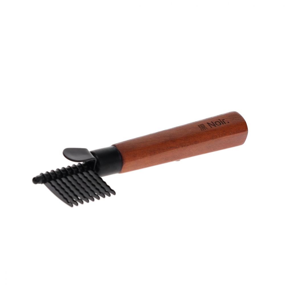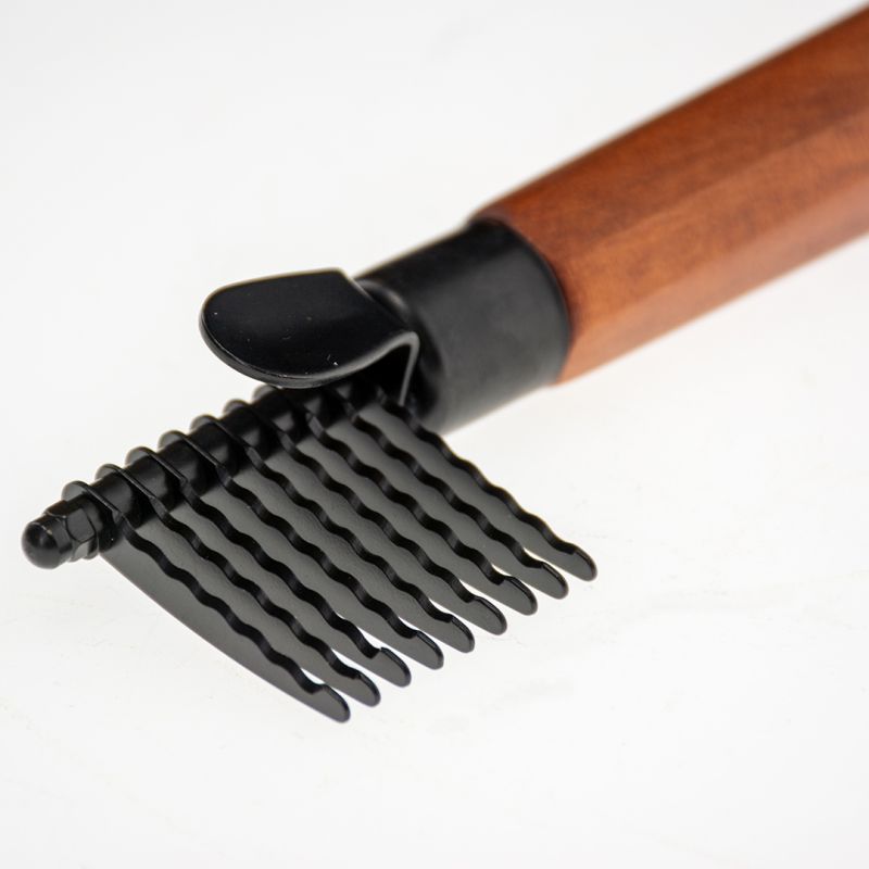 Deze Noir Japandi kam van gegalvaniseerd roestvrijstaal met 9 golvende snijbladen voor pijnloze verwijdering van klitten en verviltingen in de vacht. Plaats de kam onder de klitten met de mesjes naar boven en snij met voorzichtige korte bewegingen. De kam is voorzien van een ergonomische handgreep van FSC-gecertificeerd beukenhout met een donker gebeitste afwerking. Geschikt voor honden en katten. Pas op! Gevaar voor letsel!