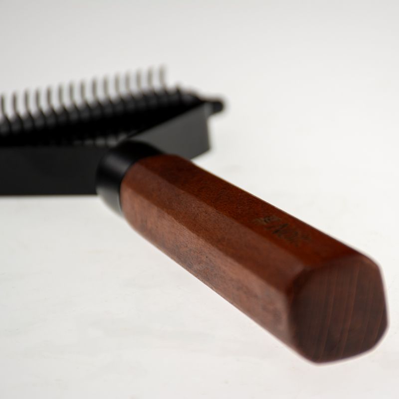 Deze Noir Japandi ontwoller van gegalvaniseerd roestvrijstaal met 20 snijbladen voor pijnloze verwijdering van losse haren en ondervacht. De snijbladen zijn afgerond voor extra veiligheid en zijn stevig vastgemaakt in een ergonomische handgreep van FSC-gecertificeerd beukenhout met een donker gebeitste afwerking. Geschikt voor honden en katten. Pas op! Gevaar voor letsel!