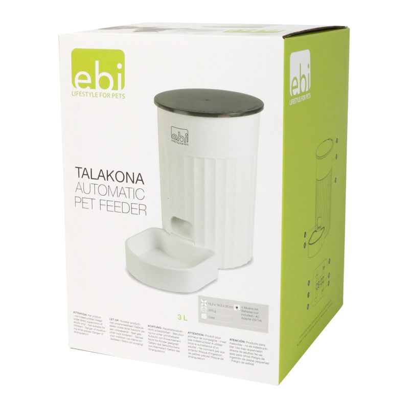 Talakona is een programmeerbaar voersysteem voor honden en katten, ideaal als je onverwacht een paar uur moet overwerken en je huisdier gewend is om op een vast moment eten te krijgen. Talakona heeft een inhoud van 3 liter en werkt met porties van 20 gram. Stel in hoeveel porties je huisdier krijgt en op welke tijdstippen. Talakona werkt via een adapter en batterijen (4x AA Alkaline batterijen + 5V adapter). Als de stroom uit zou vallen blijft het voerssyteem tijdelijk werken op de batterijen, dus geen nood mocht de stroom uit vallen. Niet aan te raden om alleen op batterijen te gebruiken, vanwege snel verbruik. Talakona is alleen geschikt voor droog voer. Het voersysteem zelf is niet geschikt voor de vaatwasser, alleen het uitneembaar voerbakje. de deksel kan goed afgesloten worden door een draaisysteem. hierdoor niet open te maken door je huisdier. WAARSCHUWING: het voersysteem is niet gemaakt om uw huisdier voor langere periode alleen te laten!
