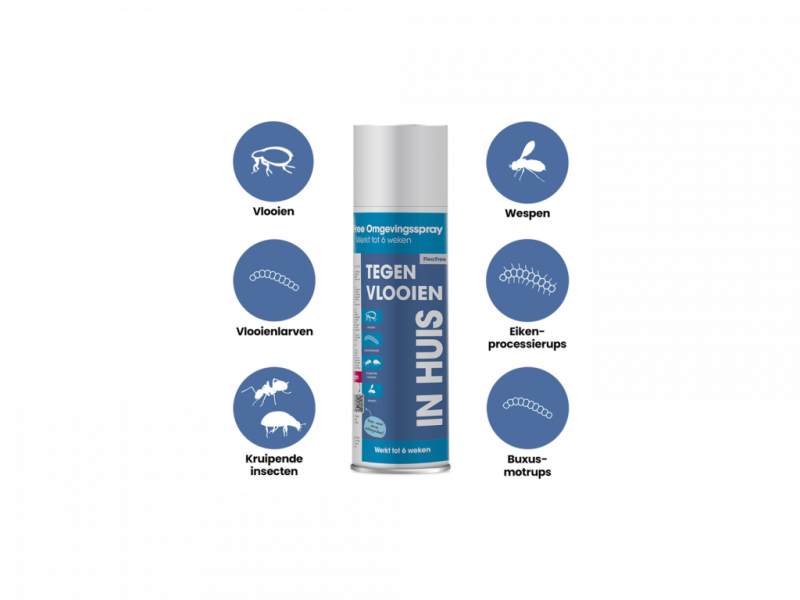 Flea Free Omgevingsspray is een spray met de werkzame stoffen Permethrin en Tetramethrin. Deze spray is vergelijkbaar met Bolfo Mand en Tapijtspray. Deze spray is bedoeld om de omgeving te behandelen tegen vlooien(larven), wespen en kruipende insecten. De omgevingsspray werkt ook tegen eikenprocessierupsen en buxusmotrupsen. Door de spray in je huis op donkere plekken, naden en kieren aan te brengen is je huis tot 6 weken behandeld tegen vlooien en vlooienlarven.