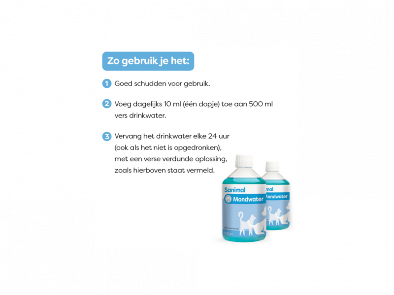 Sanimal Mondwater bewaar je op een koele, droge plaats, uit direct zonlicht. Na openen binnen 2 maanden gebruiken.
