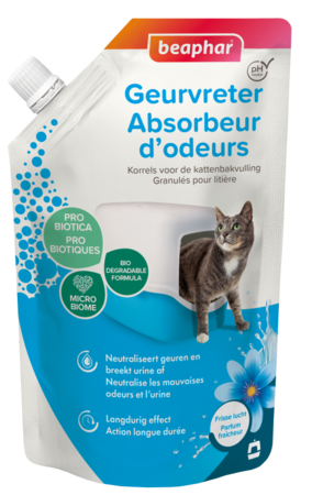 Geurvreter zorgt voor een blijvend frisse kattenbak. Geurvreter neemt de urine direct op. De unieke structuur van de korrel kapselt de urine in. Hierdoor kan de geur niet meer ontsnappen. Vervolgens worden urine en geur door natuurlijke bacteriën afgebroken. Door dit proces blijft de kattenbak hygiënisch en wordt de levensduur van de kattenbakvulling tot 2 x toe verlengd. Omdat de urine zeer snel wordt ingekapseld is maar een heel klein beetje parfum toegevoegd. Dit is een enorm voordeel, want katten hebben een hekel aan sterke parfums. Beaphar Geurvreter is biologisch afbreekbaar en volledig veilig voor katten.