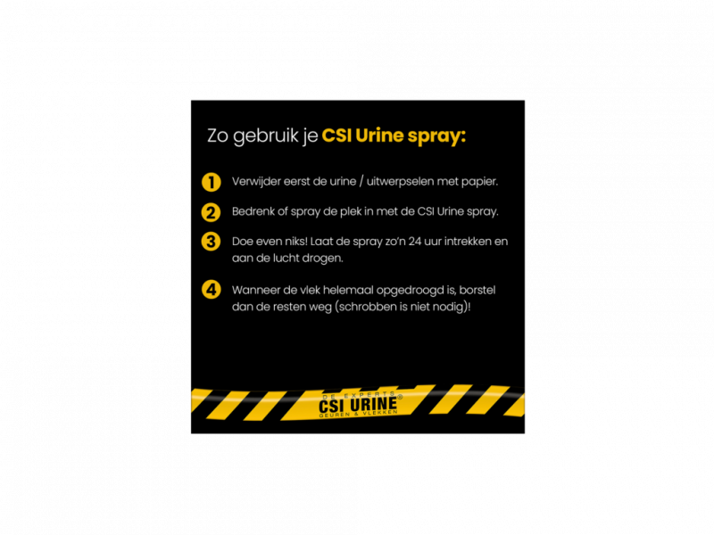 - Bedrenk of spray de plek in met de CSI Urine geur- en vlekverwijderaar.