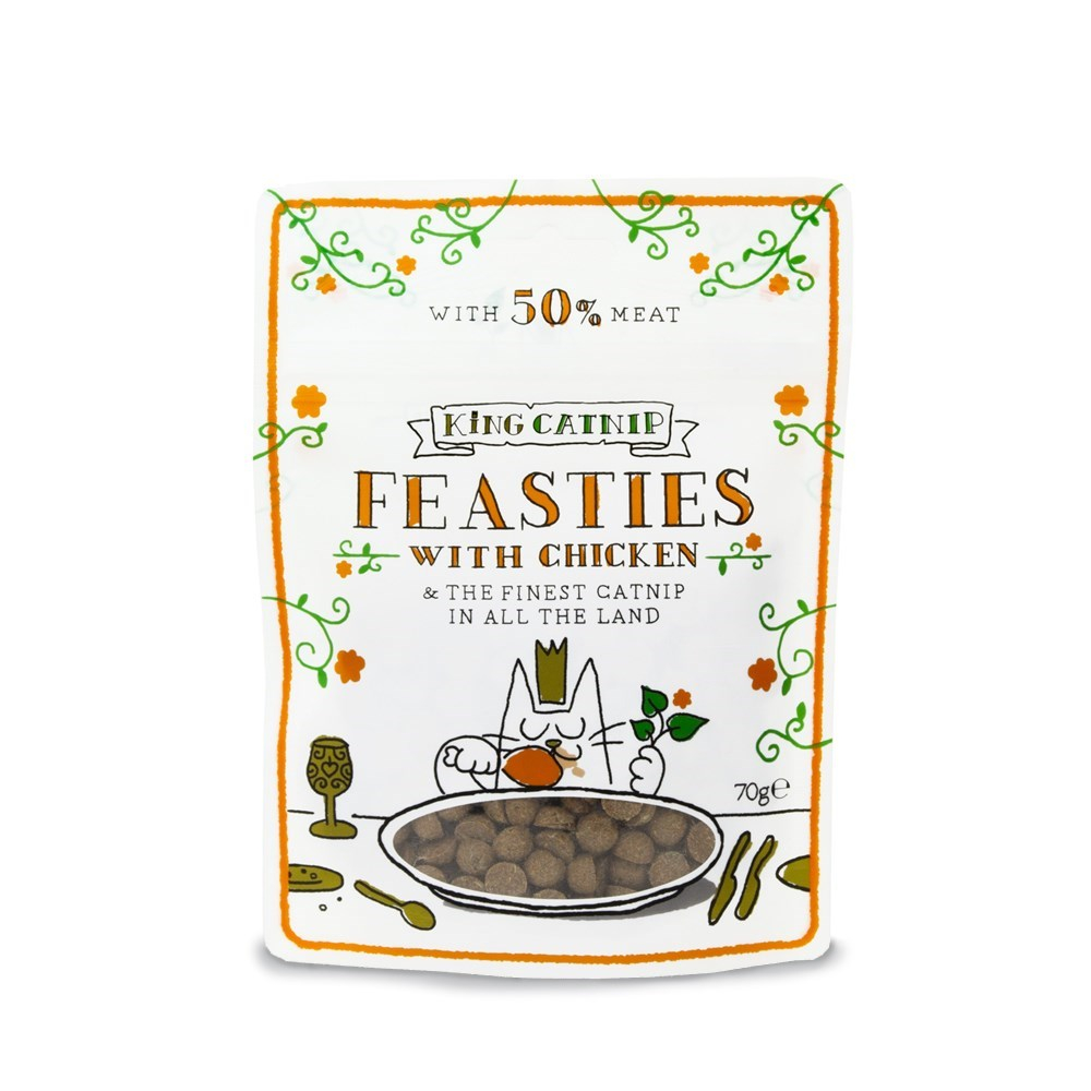 Onze Feasties Chicken Cat Treats gebruiken uitsluitend natuurlijke ingrediënten, zijn zeer goed verteerbaar en zitten boordevol vlees voor een gezonde eiwitboost. Zalmolie is geweldig voor de huid en onze premium Noord-Amerikaanse kattenkruid zal zelfs de meest kieskeurige katten verleiden!