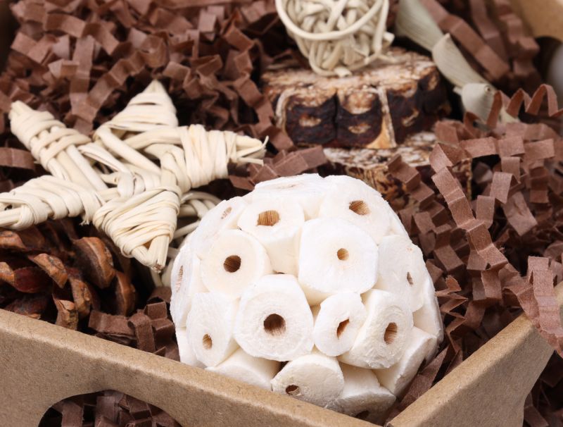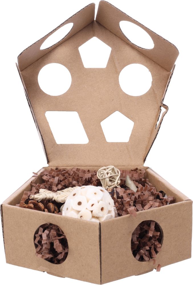 - Gevuld met hooi, kokosnoot, loofah, mahoniepeulen, palmbladeren, papier, rotan en sola hout voor extra speelplezier